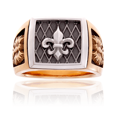 Extravagantes Ring-Modell mit individuellem Wappen oder Motiv auf geschwärztem Rautenmuster.